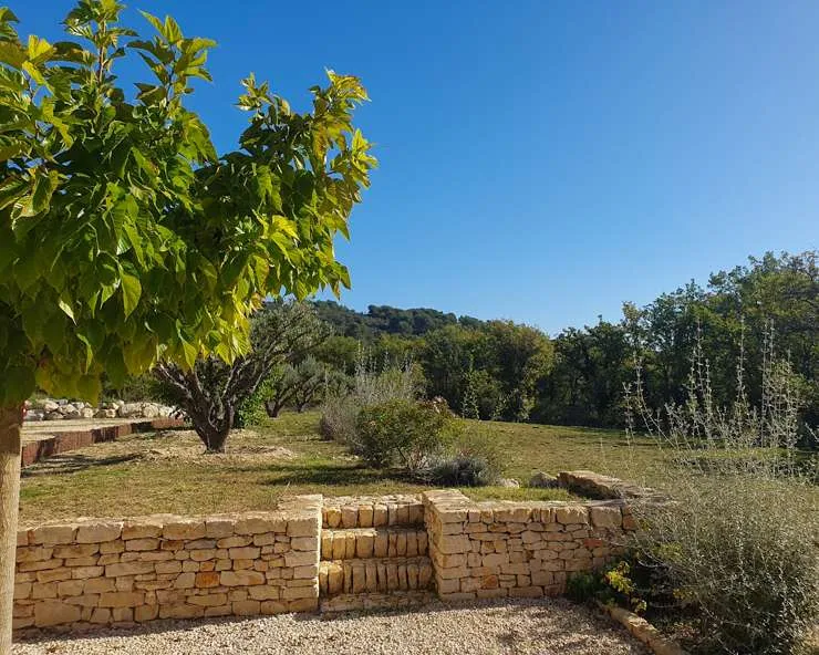 Au milieu d’un beau jardin naturel (oliviers, chênes truffiers), les pierres modernes et anciennes se mêlent pour créer une maison de vacances réussie.