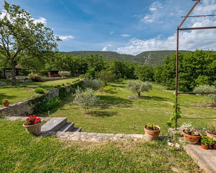 Mitten in einem schönen naturbelassenen Garten (Olivenbäume, Trüffeleichen), vermischen sich moderne und alte Steine zu einem gelungenen Ferienhaus.