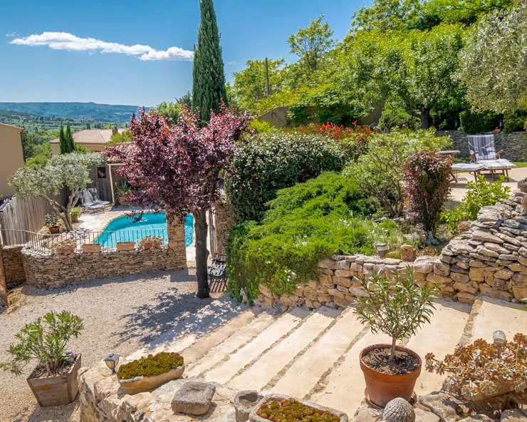Dieses außergewöhnliche Dorfhaus an den alten Mauern von Roussillon verzaubert mit großem Garten, Pool, Poolhouse und spektakulärer Aussicht über das Luberon-Tal.